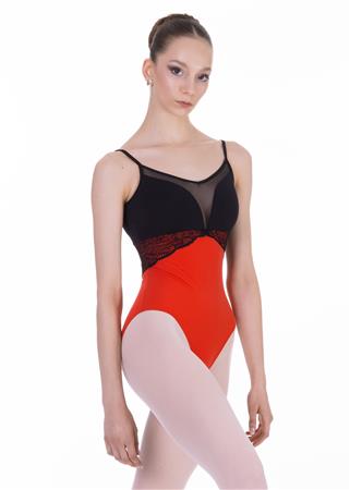 Strong mesh trim at the neck and bust defines this elegant camisole leotard with an empire waist. Scalloped lace adds a refined touch as it wraps from front to back, complemented by a charming strappy back design.