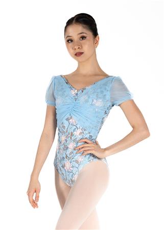 Our enchanting floral print takes center stage on this cap-sleeve leotard. A shirred mesh front overlay adds elegance, while an adjustable pinch enhances the low-back design.