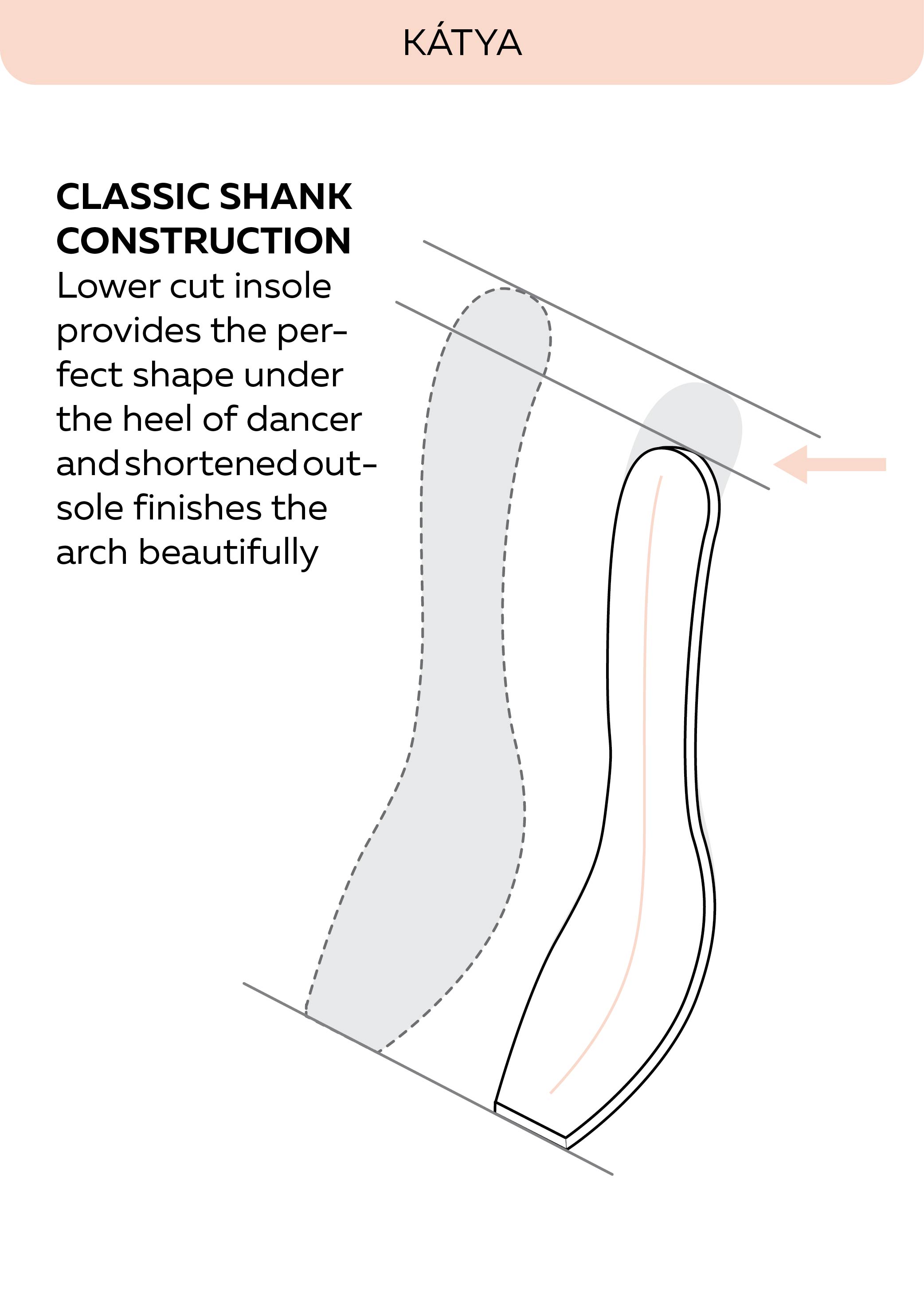 A combination of classic and high-end technologies gives proper support and easy roll-up. The shank (-5 mm) and the sole (-10 mm) are shorter compared to other NIKOLAY™ styles, and it gives extra flexibility in the heel part in addition to perfect fit, that follows the shapes of foot. Ideal shoes for contemporary dance with a combination of easy roll-up and cut sole.