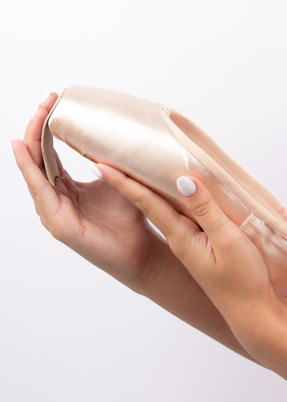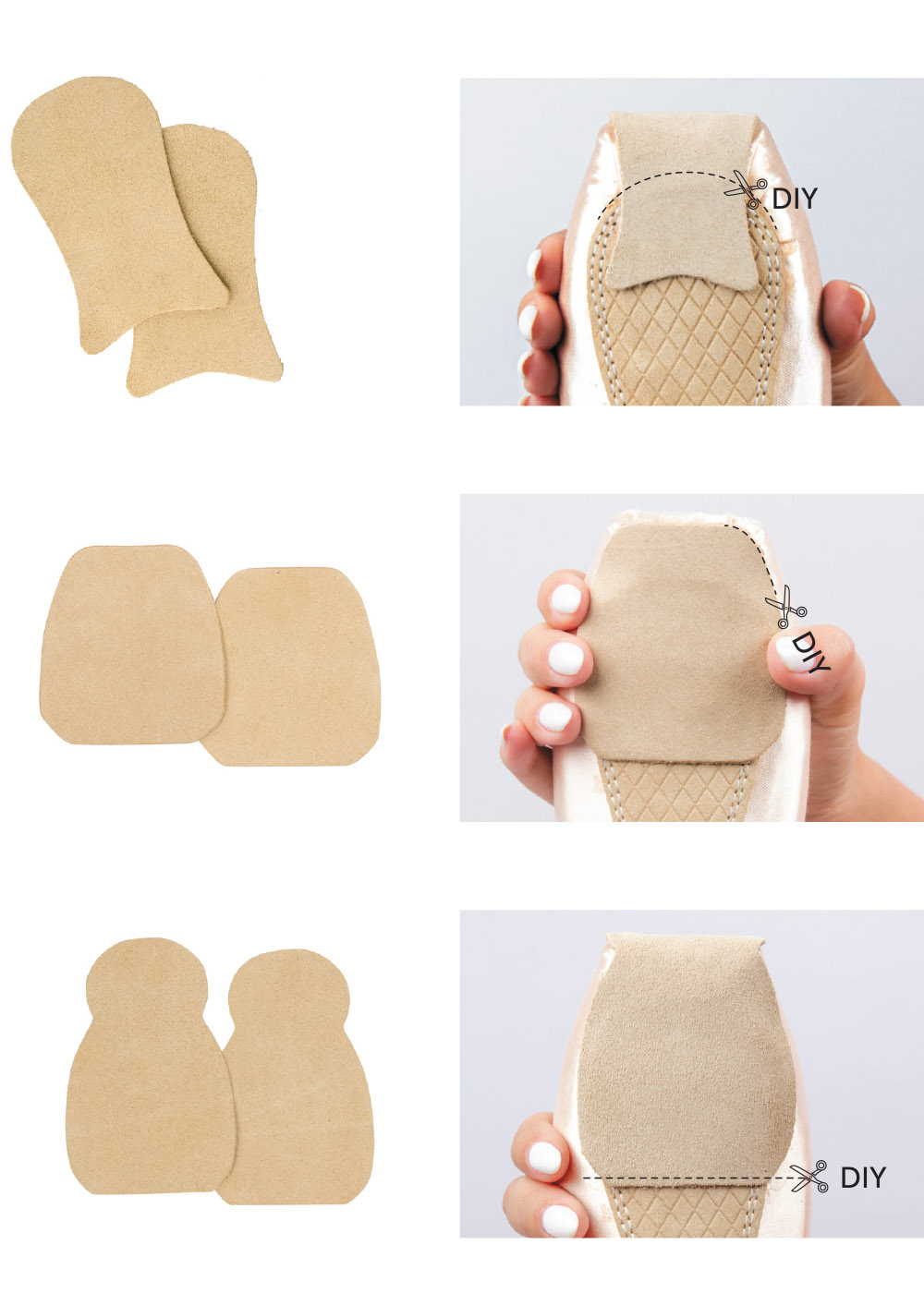 Glue the Pointe shoe caps made of beige suede to protect the toes. Natural leather.